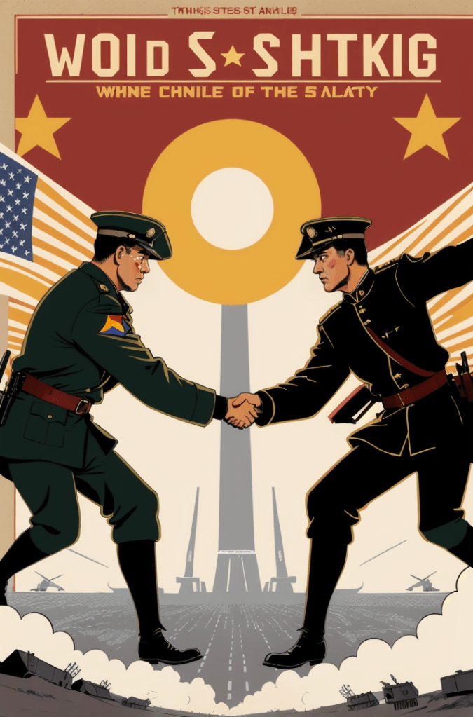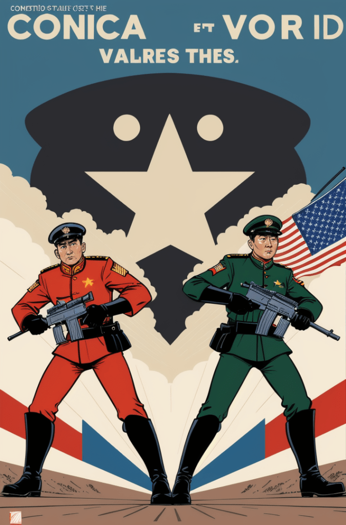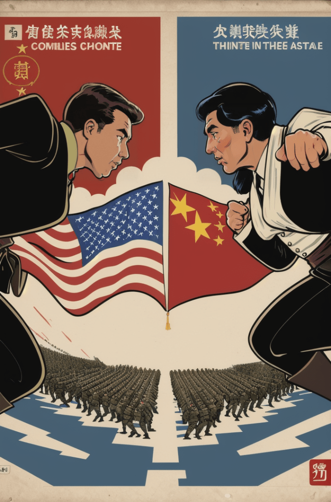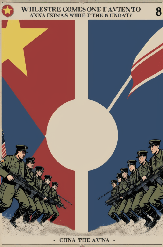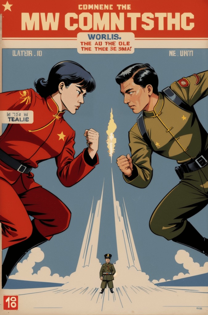 This captivating comic book cover is a haunting portrayal of the growing tensions between two of the world’s powerhouses – the United States and China. Yet, in its portrayal, there’s a timeless echo, a silent hymn of the Cold War era, resounding the whispers of a world that once stood on the precipice of nuclear annihilation.