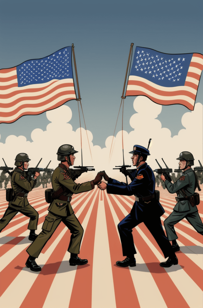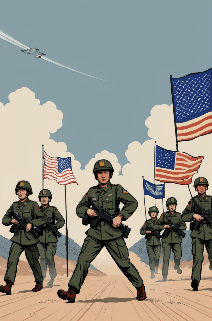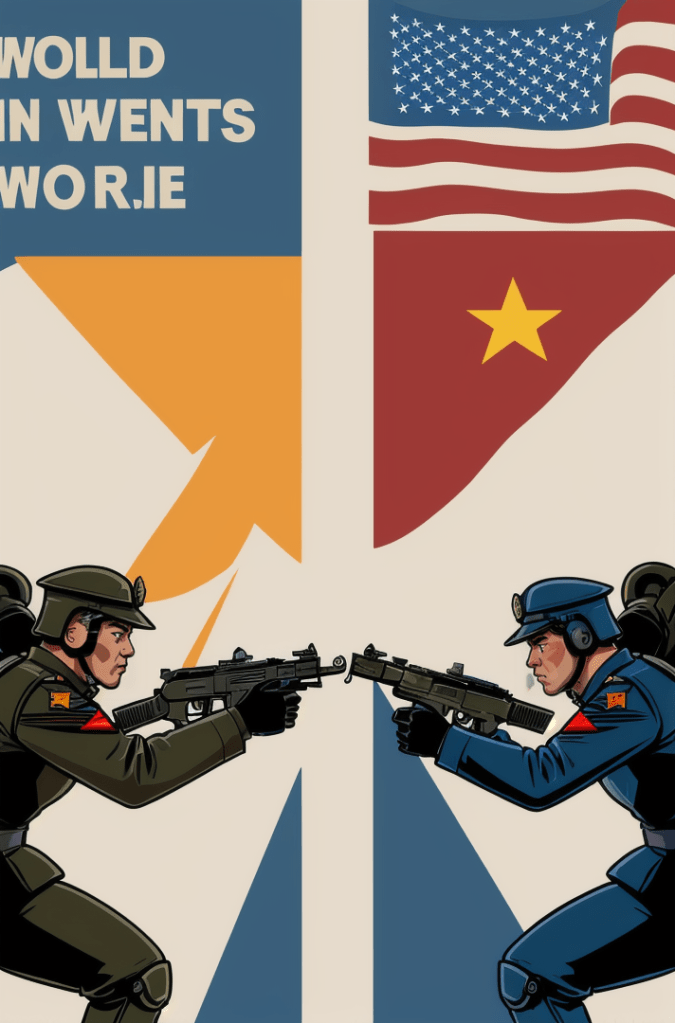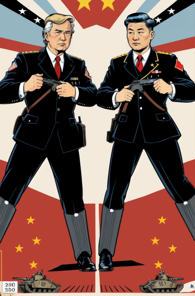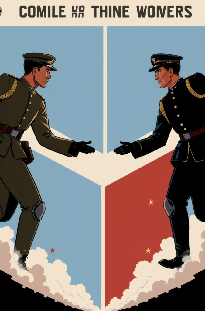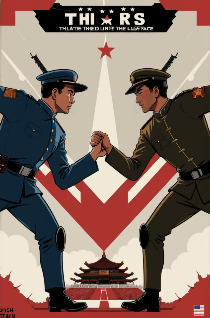 This captivating comic book cover is a haunting portrayal of the growing tensions between two of the world’s powerhouses – the United States and China. Yet, in its portrayal, there’s a timeless echo, a silent hymn of the Cold War era, resounding the whispers of a world that once stood on the precipice of nuclear annihilation.