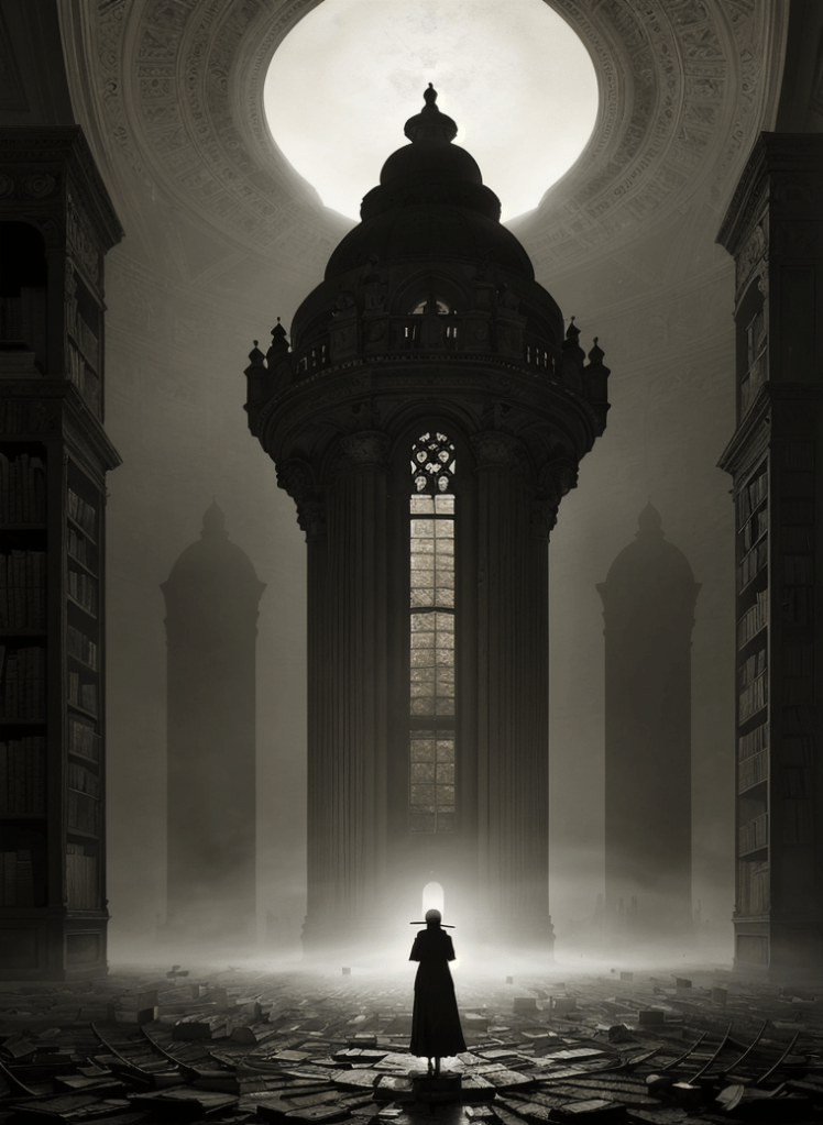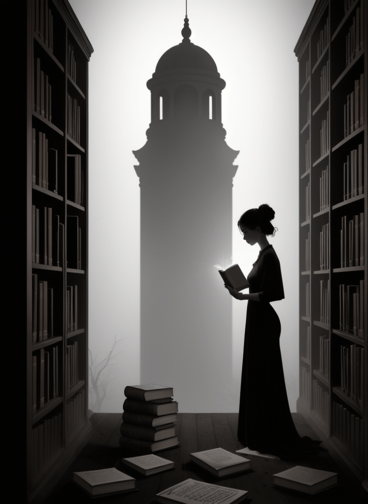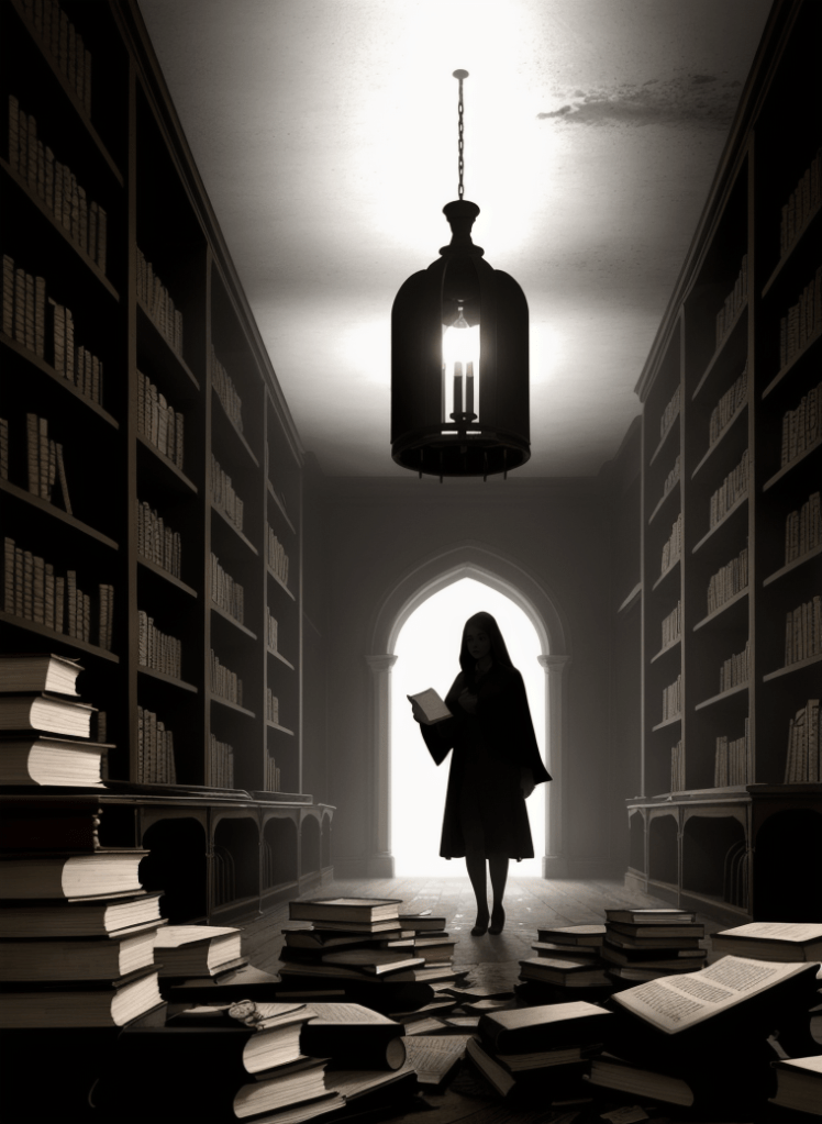 Yet, amidst the encroaching darkness, a lone figure of resilience emerges – the last librarian. She is not just a guardian of books but a custodian of the final echoes of wisdom and enlightenment. In her hands, a book – not just bound pages, but a radiating beacon of hope – illuminates the impending doom, casting light upon shadows of neglect.