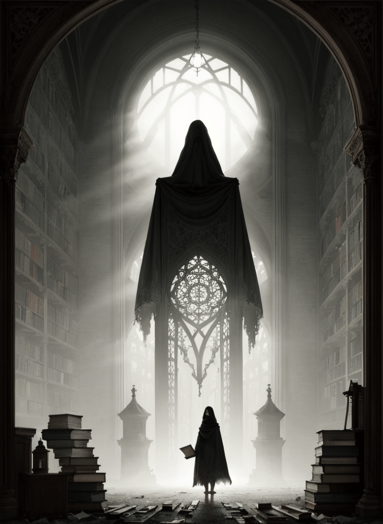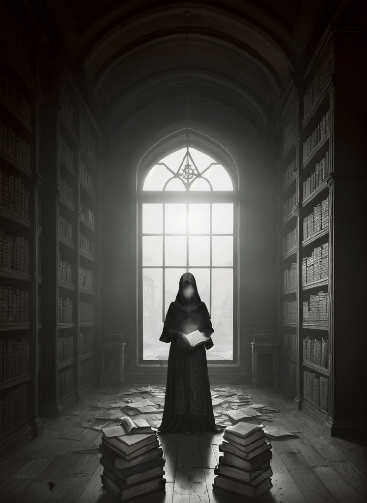 - The stark contrast between the illuminated book in the librarian’s hands and the shadowed, forsaken library.