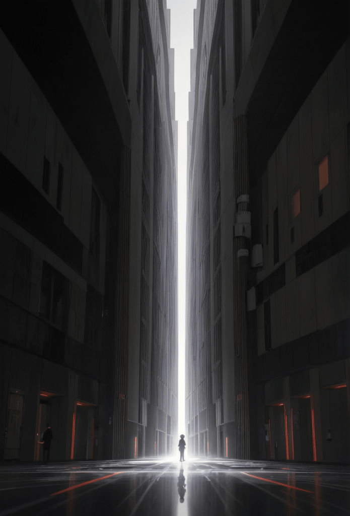 Hovering above this scenario is money, depicted as streams of vibrant light suspended above an ominous abyss. It is not just currency but the embodiment of security, livelihoods, and a nation’s pulse, now hanging in volatile suspension. Every dollar bill illuminating in the dark signifies the collective risk and individual impacts that ripple across a nation on the brink of silence.