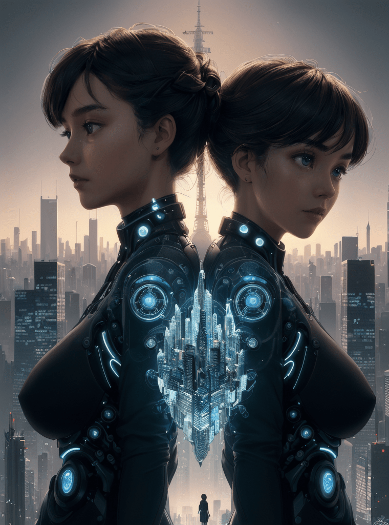 comic book cover. An intricately detailed cityscape where technology and humanity are intertwined, forms the backdrop. In the forefront, a human detective and an AI with visible emotions stand united, showcasing a world where souls aren’t defined by biological boundaries.