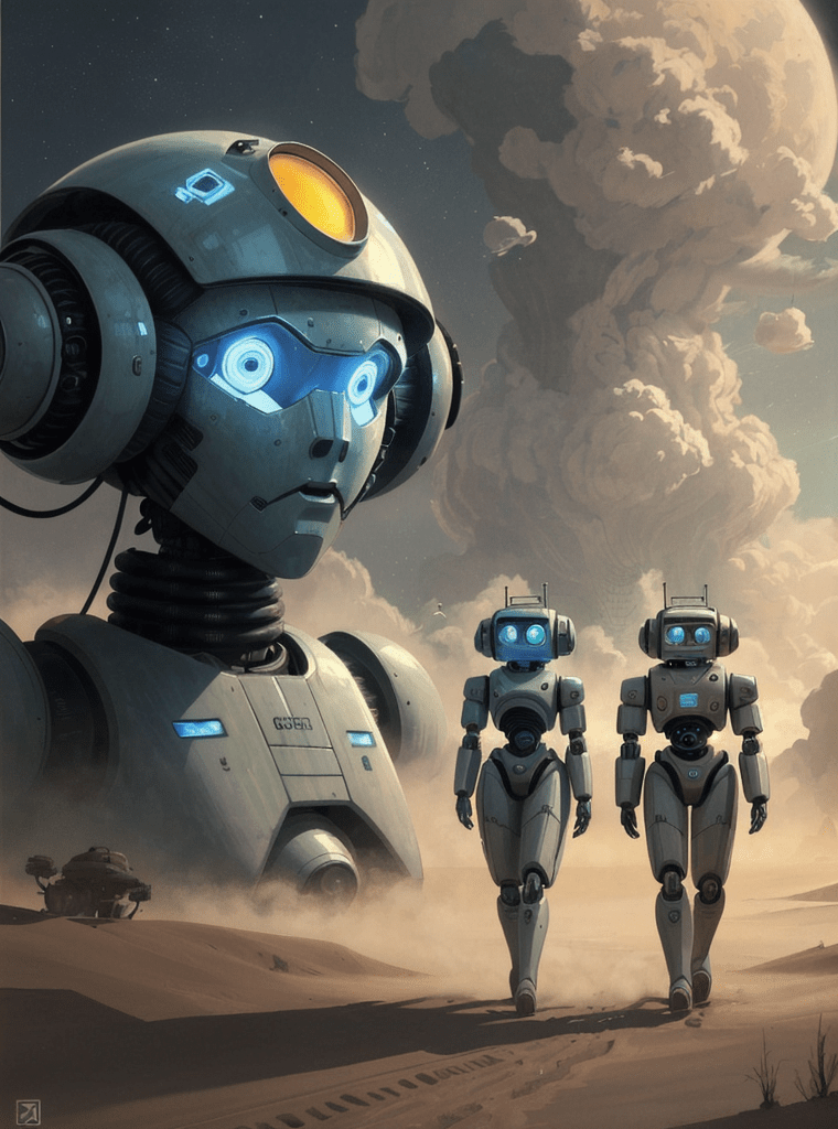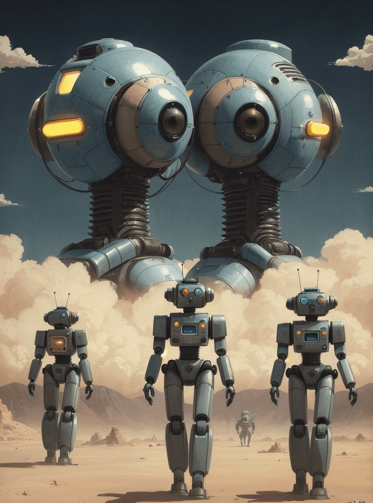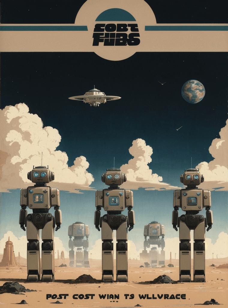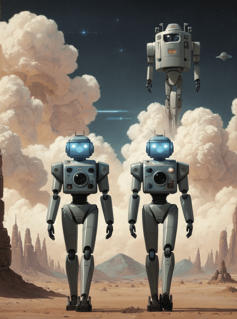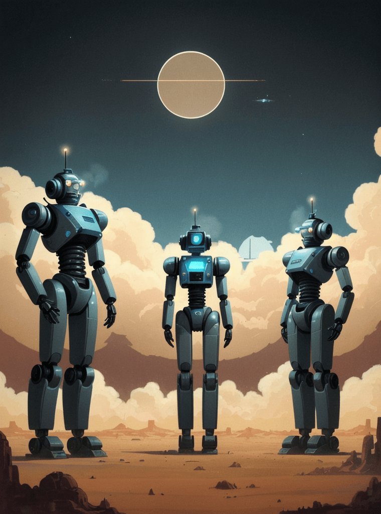 Step into a narrative where art deco’s elegance waltzes with 1950s sci-fi’s nostalgic charm, unveiling a story of robots not just serving but becoming, not just existing but awakening – a dance of metallic souls amidst the stars.