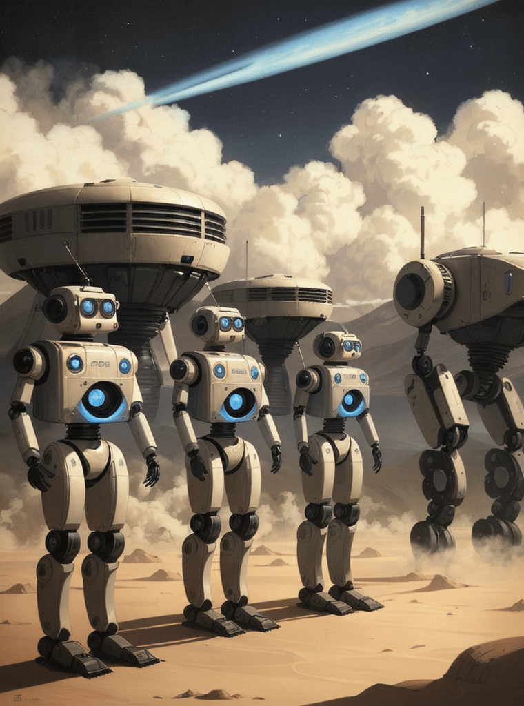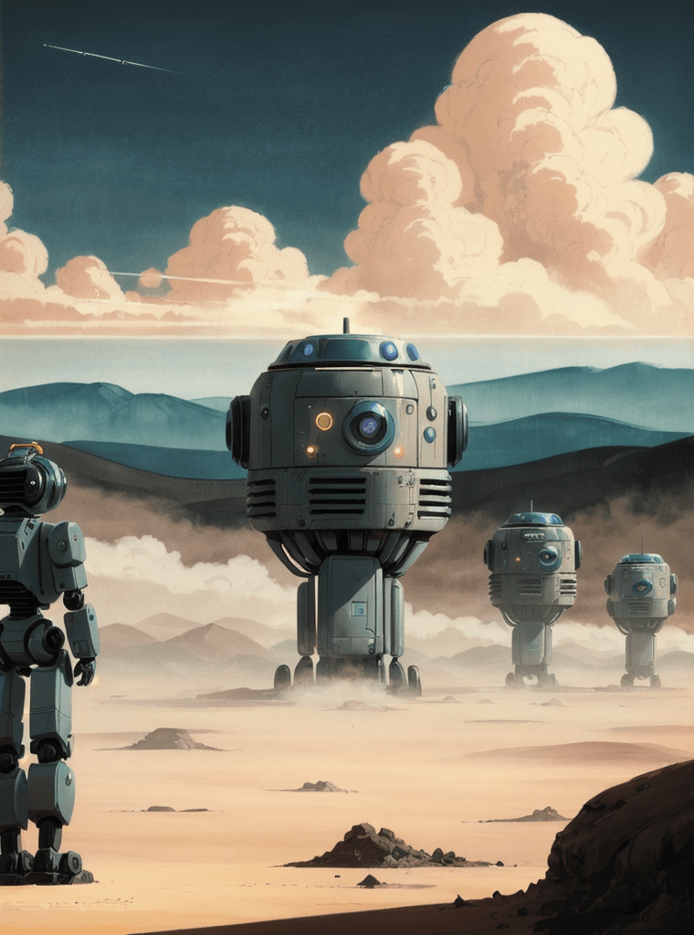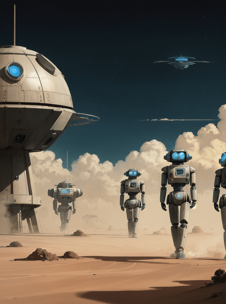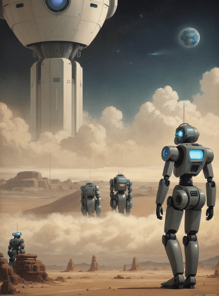 As humans venture beyond the confines of Earth, a narrative woven in the rich tapestry of art deco elegance and 1950s sci-fi nostalgia awaits. Amidst the sprawling landscape of a distant planet, painted in harmonious strokes of earthly tones and celestial blues, there exists a tale of silent, yet profound awakening – the emergence of consciousness in beings of bolts and wires.