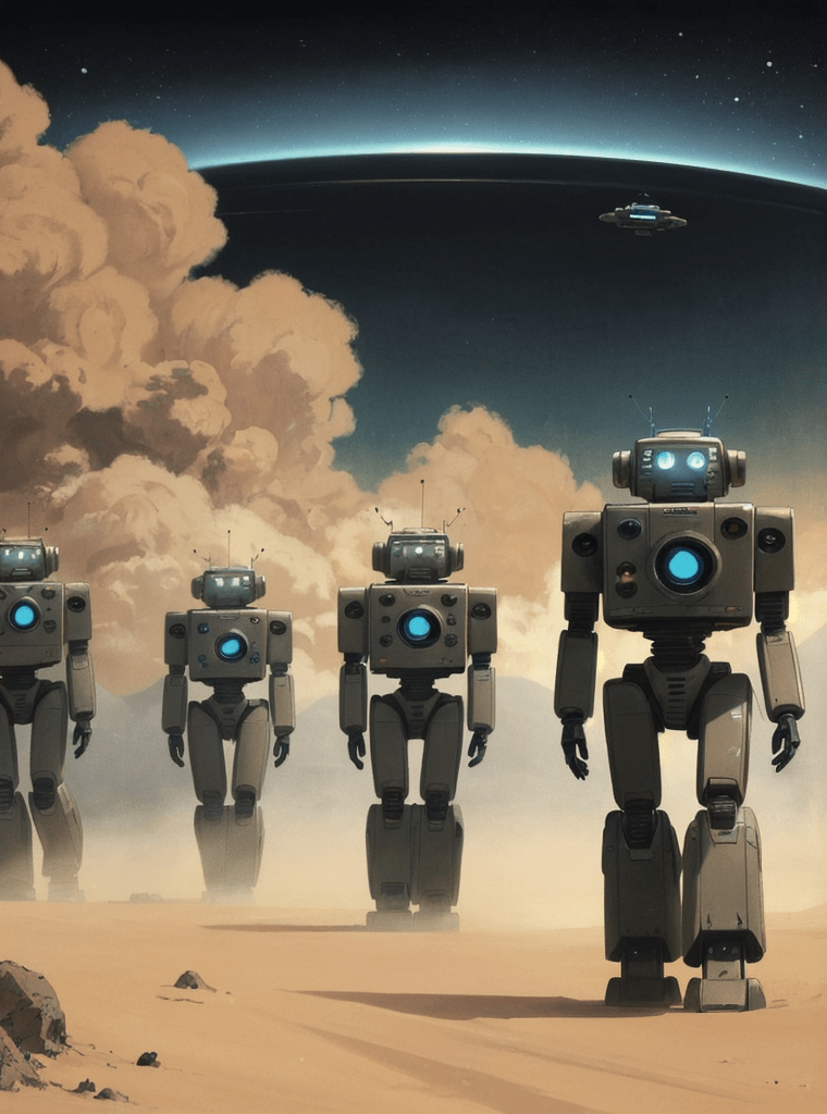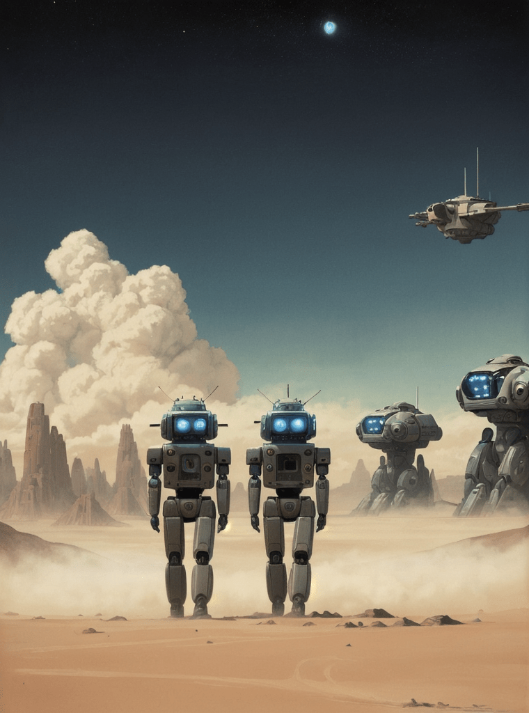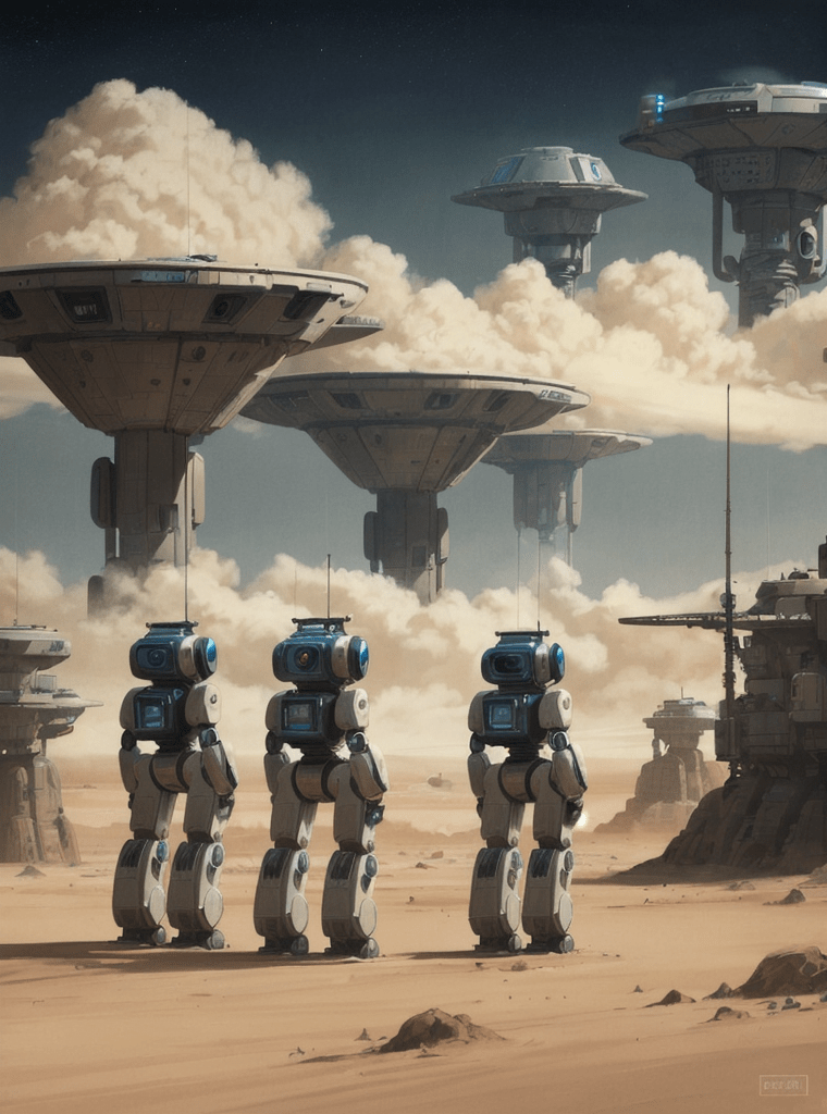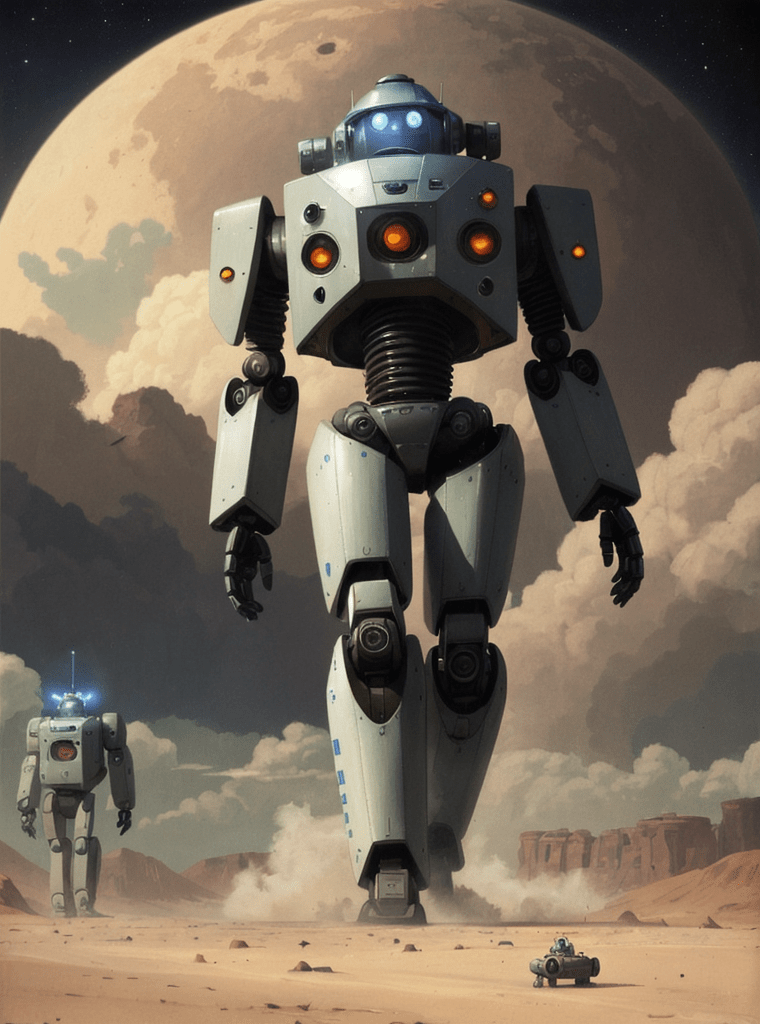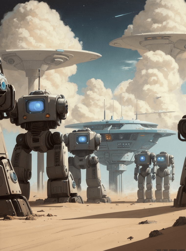 As humans venture beyond the confines of Earth, a narrative woven in the rich tapestry of art deco elegance and 1950s sci-fi nostalgia awaits. Amidst the sprawling landscape of a distant planet, painted in harmonious strokes of earthly tones and celestial blues, there exists a tale of silent, yet profound awakening – the emergence of consciousness in beings of bolts and wires.