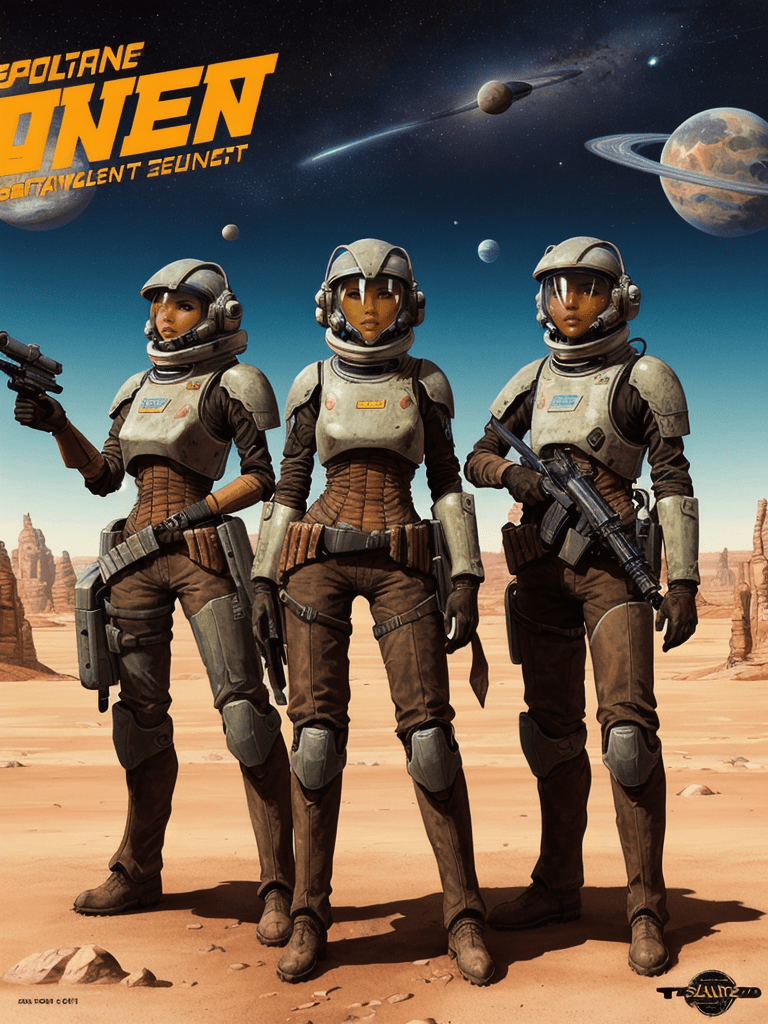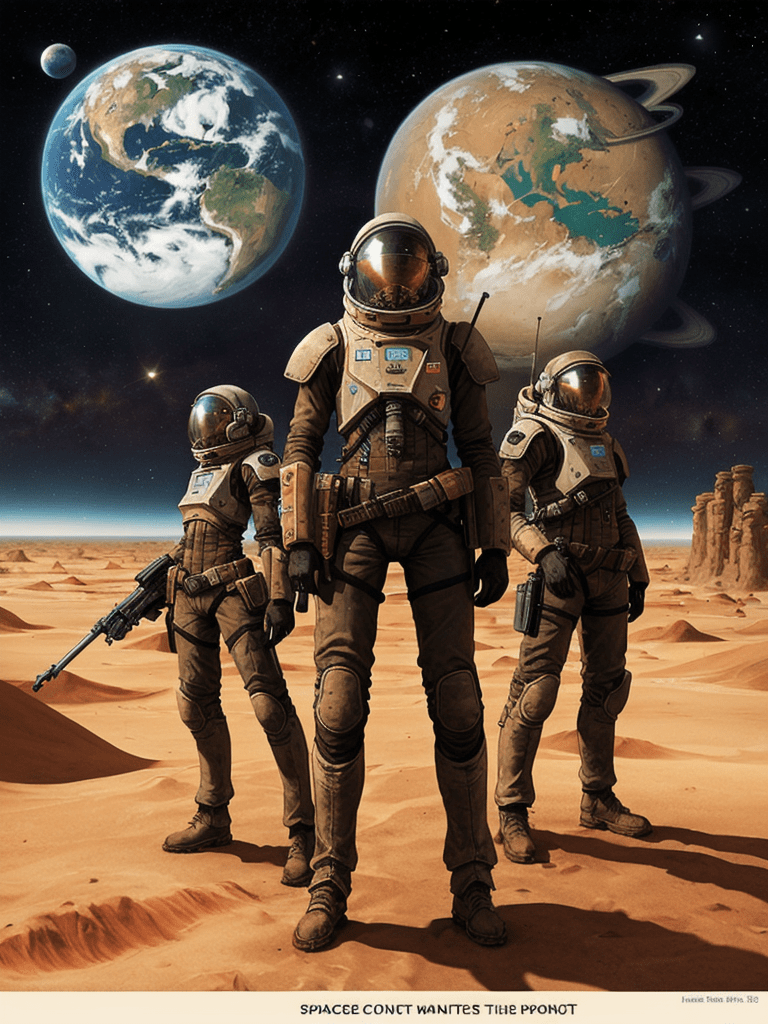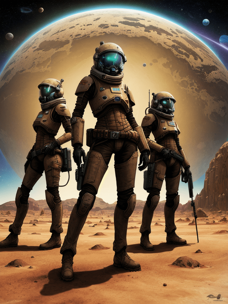 As you delve deeper into the “Galactic Gunslingers,” every earth tone unveils a chapter of the space western, where the arid and the cosmic, the silent and the sonorous, weave a narrative that’s as profound as the silent dance of the galaxies and as haunting as the echoes of the windswept deserts.