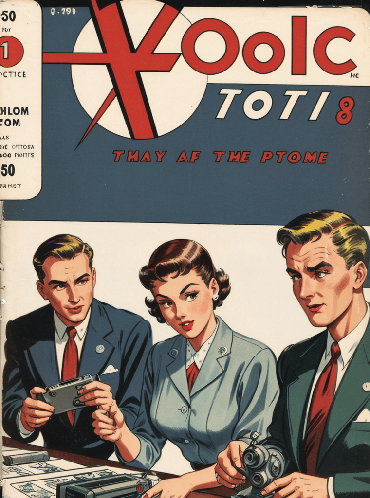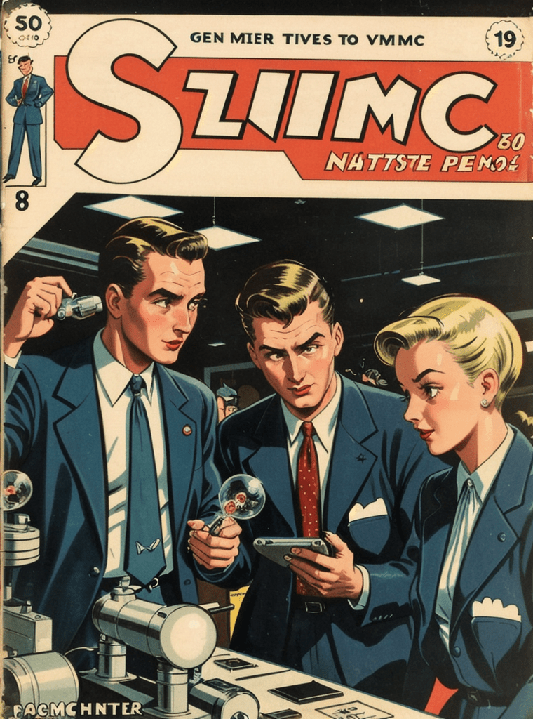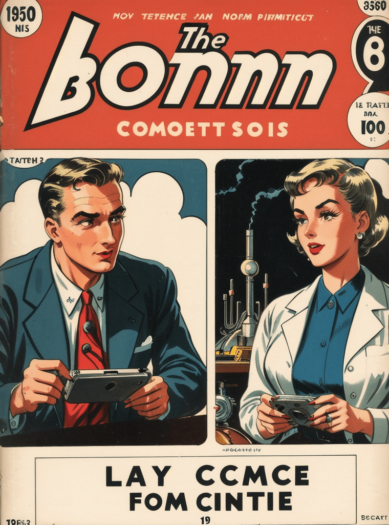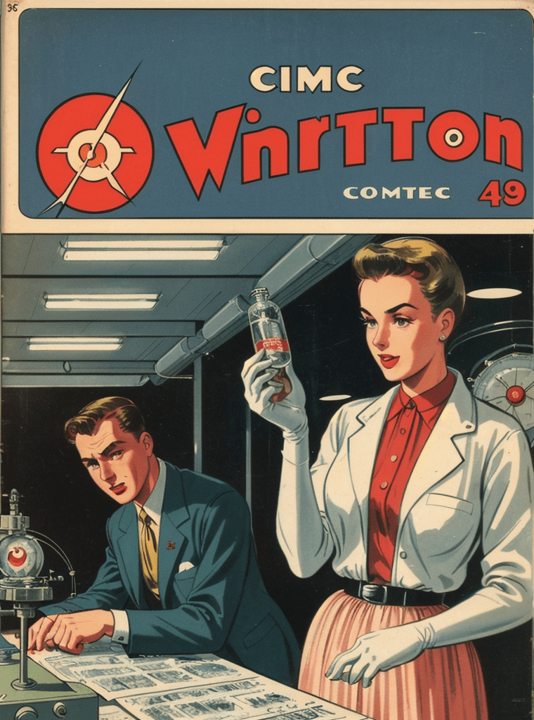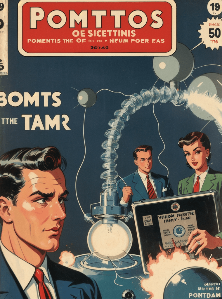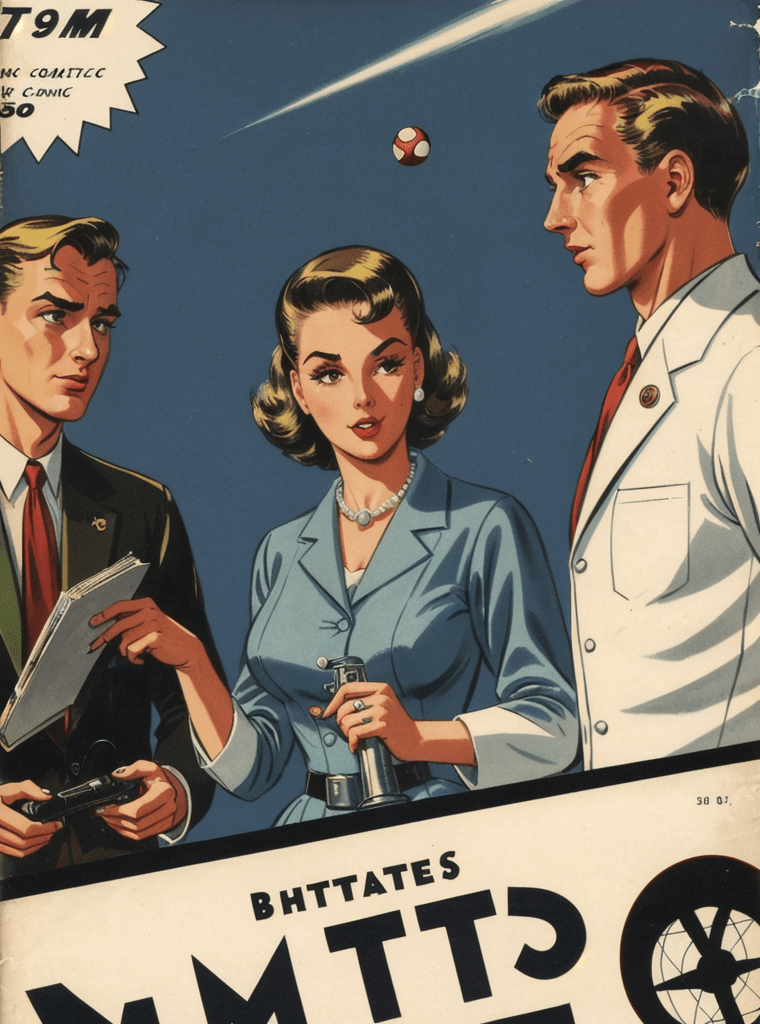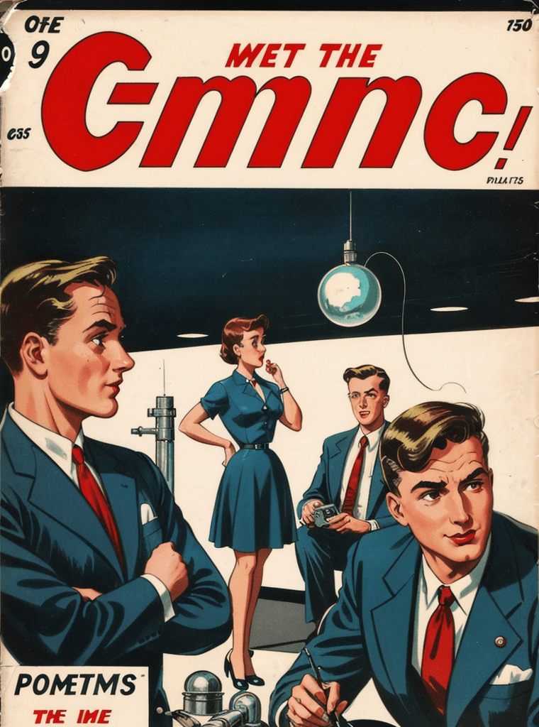 In the alluring and enigmatic landscape of the 1950s, amidst the boom of innovation and the silent whispers of Cold War tensions, a narrative of science, power, and sinister intentions unfolds — encapsulated exquisitely in the iconic comic book cover of “Echoes of the Atomic Dawn.”