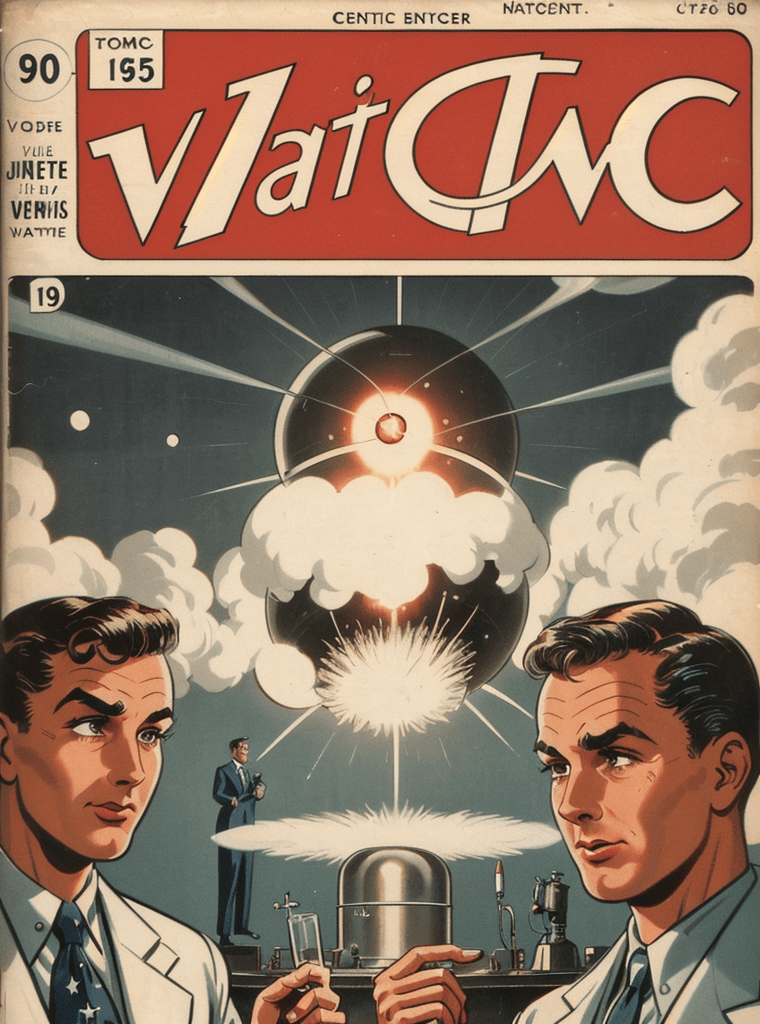 This comic book cover invites us to a world where vintage artistry is a silent yet eloquent narrator of an era where every atomic revelation echoed the silent, tumultuous dance of promise and peril, innovation and intrigue, discovery and secrecy.