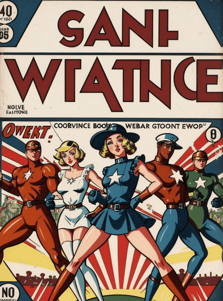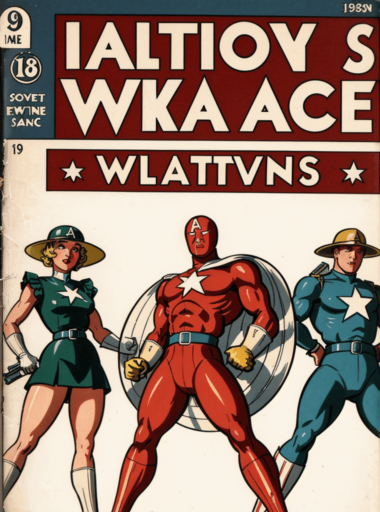 Journey into a vintage narrative where the echoes of war are not just heard but felt, where global superheroes are not just figures of power but silent echoes of resilience, and where every illustrated stroke is a haunting yet beautiful reminder of the complex, tumultuous dance of an era defined by nations at war and heroes rising amidst the silent shadows of conflict.