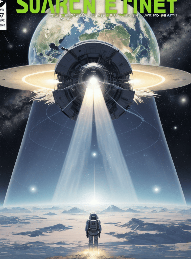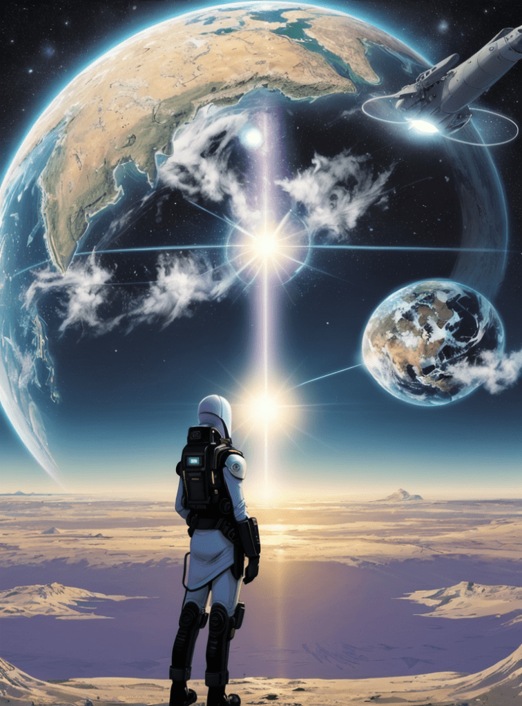 The first image captures the moment an explorer named Arion, clad in a state-of-the-art spacesuit, gazes upon the marvel of the Ascension Gate. This gate, powered by the energy of a collapsing star, was the universe’s most magnificent creation, permitting beings to traverse its expanse in mere moments. The looming spacecraft overhead, the HLS StarProbe, was humanity’s flagship, tasked with studying the gate’s mysterious power.