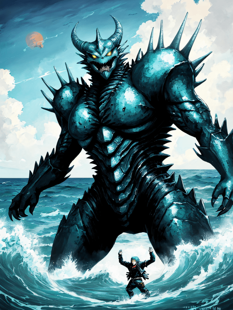 In the first image, Azural rises from the depths, backlit by the sun’s halo. His presence was both a sign of protection and a forewarning of impending chaos. The seas around him danced with turmoil, a testament to his immense power.